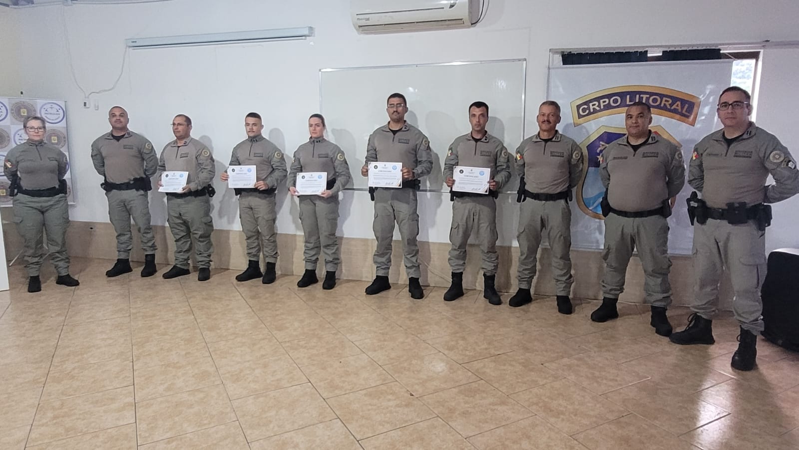 A solenidade de formatura contou com a presença de autoridades da Brigada Militar, incluindo os comandantes do 2º BPAT, 8º BPM e EsFES/Osório, além de representantes do CRPO Litoral.